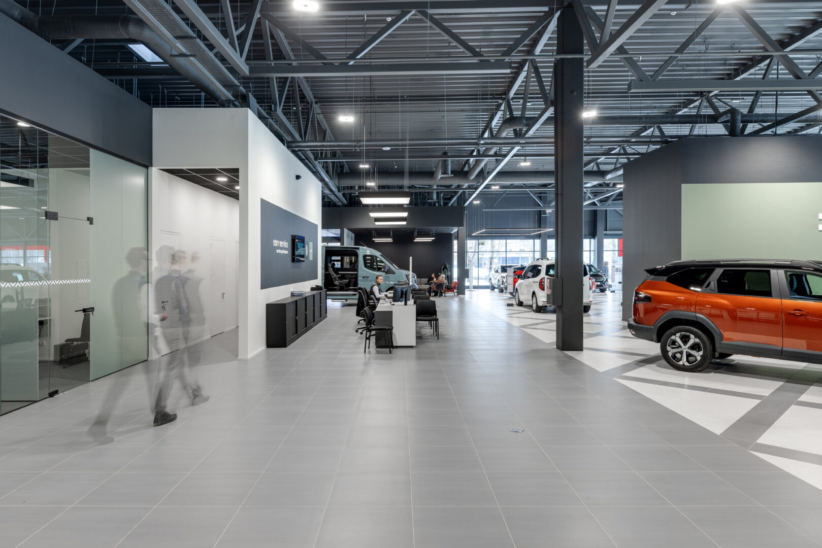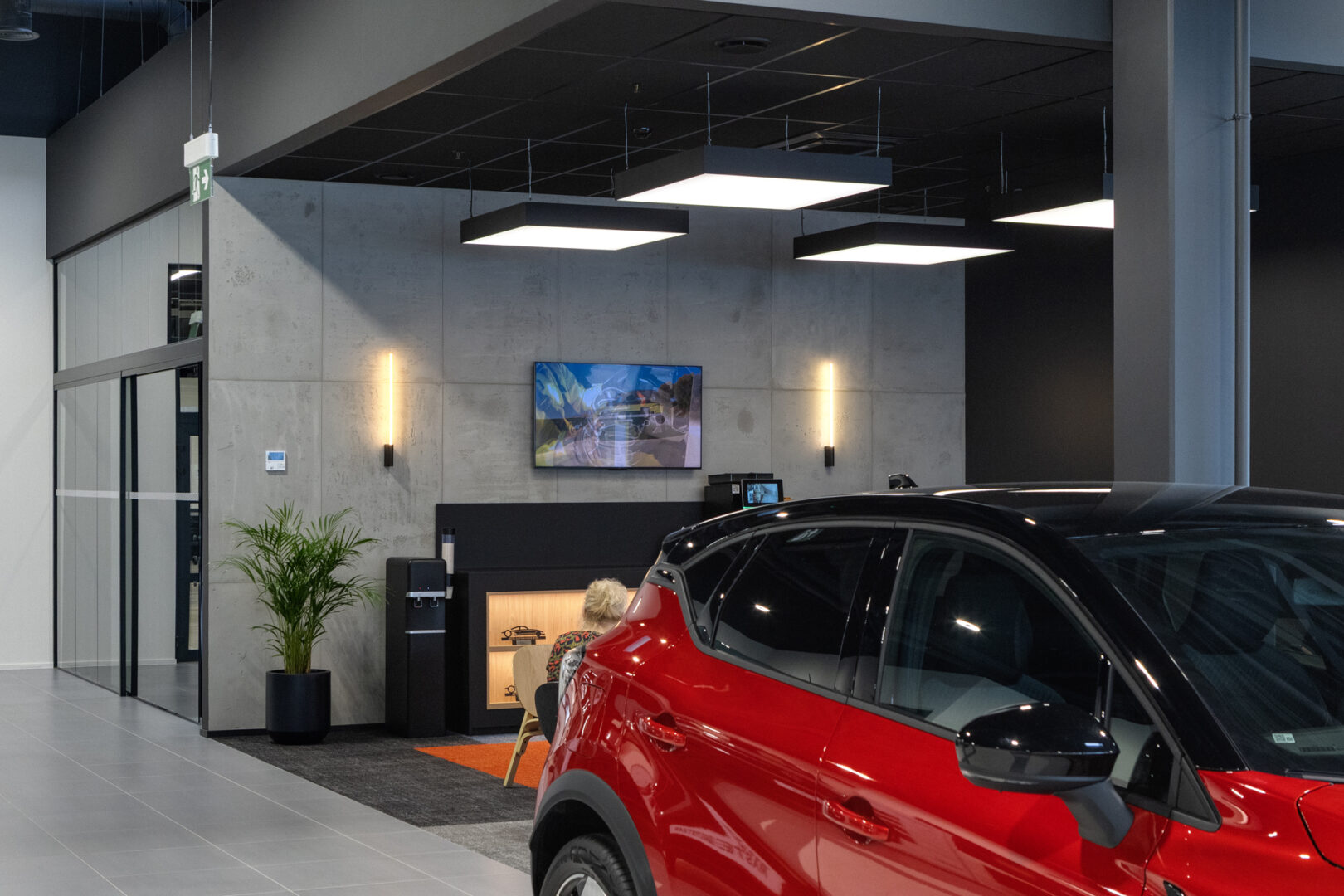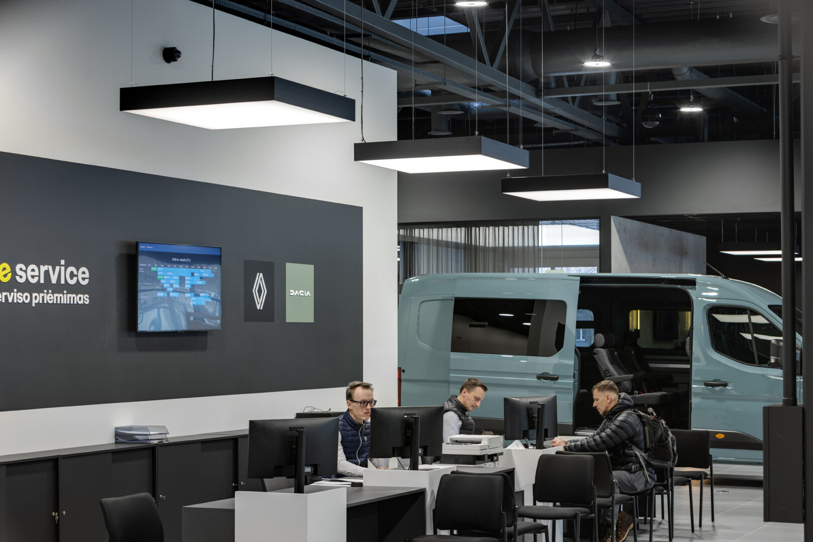 Salone buvo suprojektuotos 2 zonos, kurios yra skirtos automobilių atidavimui klientams, įsigijusiems naujus automobilius. Pagal architektų idėją – šiose zonose numatytos dvejos šviečiančios lubos, įleistos į juodos spalvos gipsines nišas, kas vizualiai atrodo kaip didžiuliai šviestuvai, kurių išmatavimai 5500 mm. x 3500 mm. Itin svarbi užduotis buvo išlaikyti tolygų apšvietimą visame plote bei užtikrinti tolygų apšvietimo intensyvumo valdymą nuotoliniu būdu. Dimeriavimo funkcija buvo atliekama naudojant nuotolinio valdymo pultelį.
